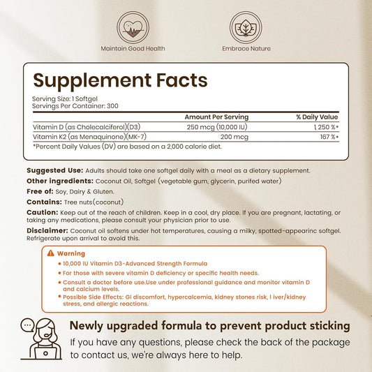 DEAL SUPPLEMENT Vitamin D3 10,000 IU + K2 MK7 200mcg Softgels, 250 Count | 2-in-1 Complex with Virgin Coconut Oil | Supports Heart, Bone, Teeth & Immune Health* | Easy to Swallow