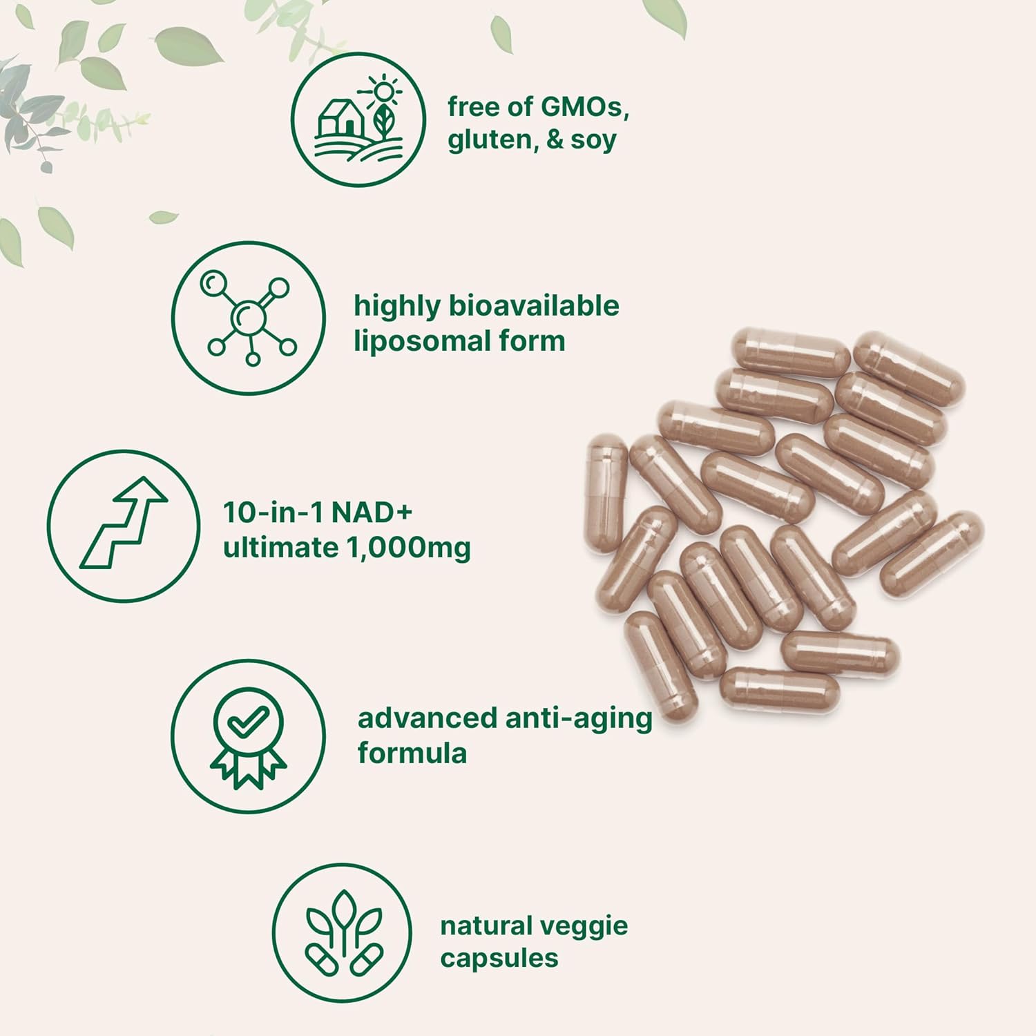 Liposomal NAD+ Ultimate 1,000mg | 60 Veggie Capsules | NMN Pathway Formula | 10-in-1 with Resveratrol, Glutathione & Astaxanthin | NAD Supplement for Women & Men | Anti-Aging, Energy, & Brain Support