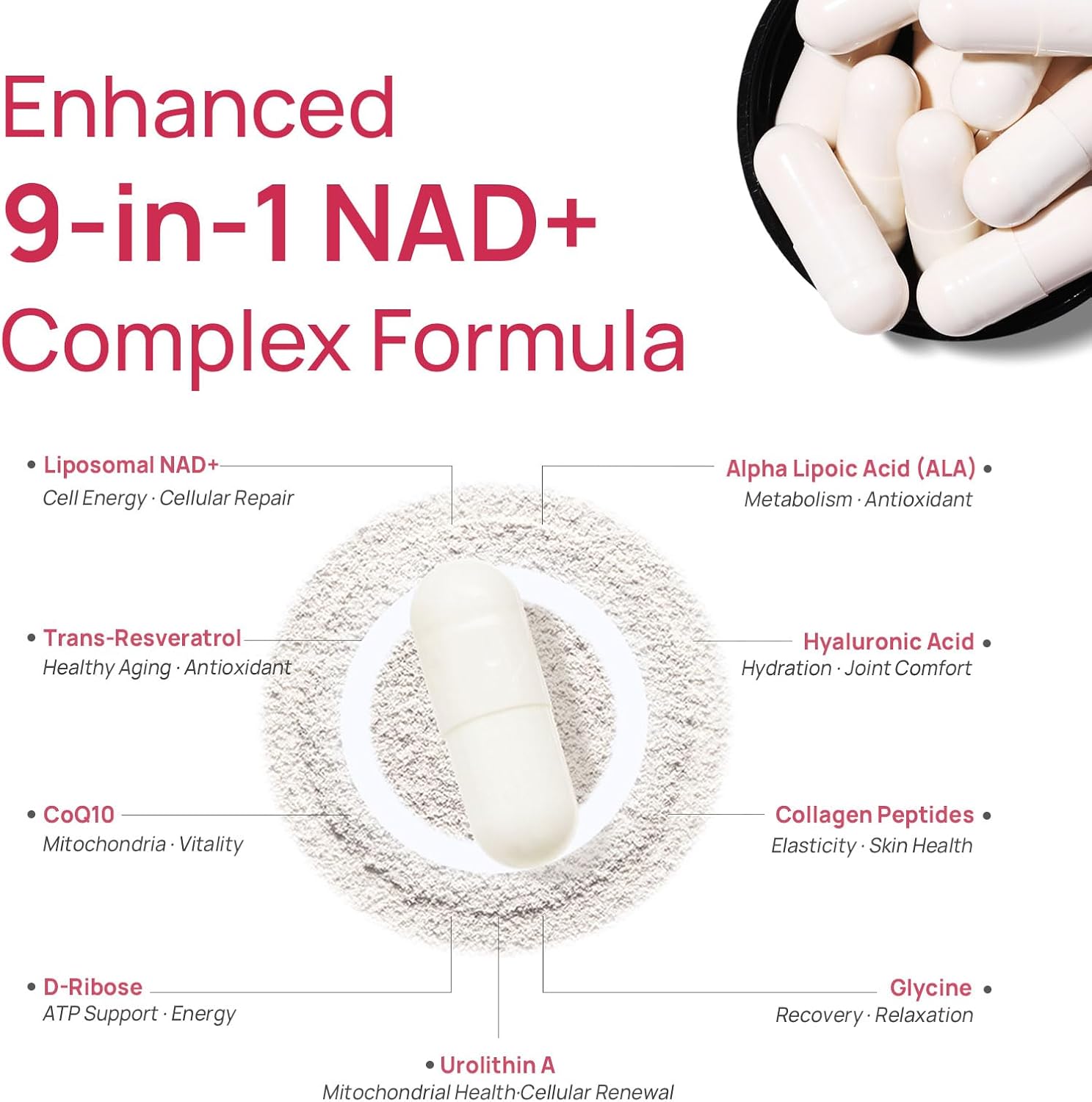 Our next-generation formula combines β-NAD+, Trans-Resveratrol, Coenzyme Q10, Urolithin A, D-Ribose, Alpha Lipoic Acid, Glycine, Hyaluronic Acid, and Hydrolyzed Collagen Peptide — all working synergistically to: