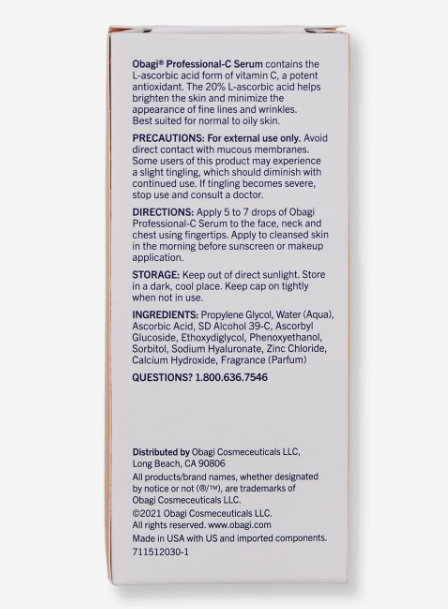 Use in both the AM and the PM as part of your cleansing ritual. Simply massage a few drops of the facial serum onto your entire face, neck, and decolletage in a circular motion until completely absorbed. A minor tingling sensation may occur when you apply Obagi Professional C-Serum 20% to your face.